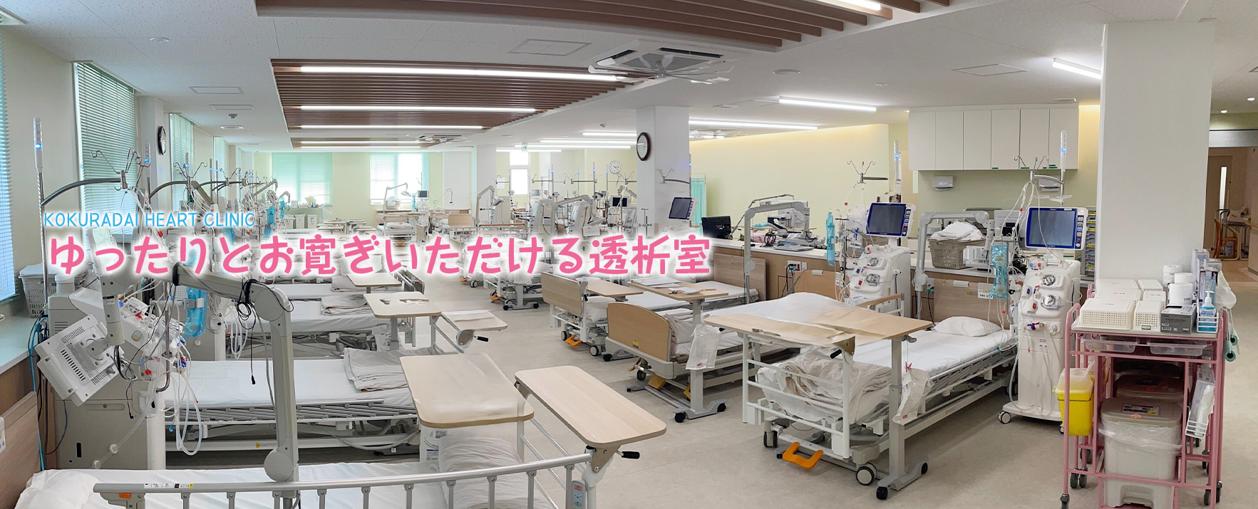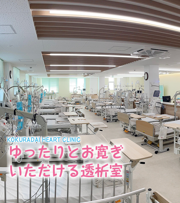 当院の血液透析治療は快適に治療時間が過ごせるように環境作りに力を入れています。 透析時、ゆったりとくつろげるように室内の明るさをおさえたり、テレビなどでリラックスできるようにしています。